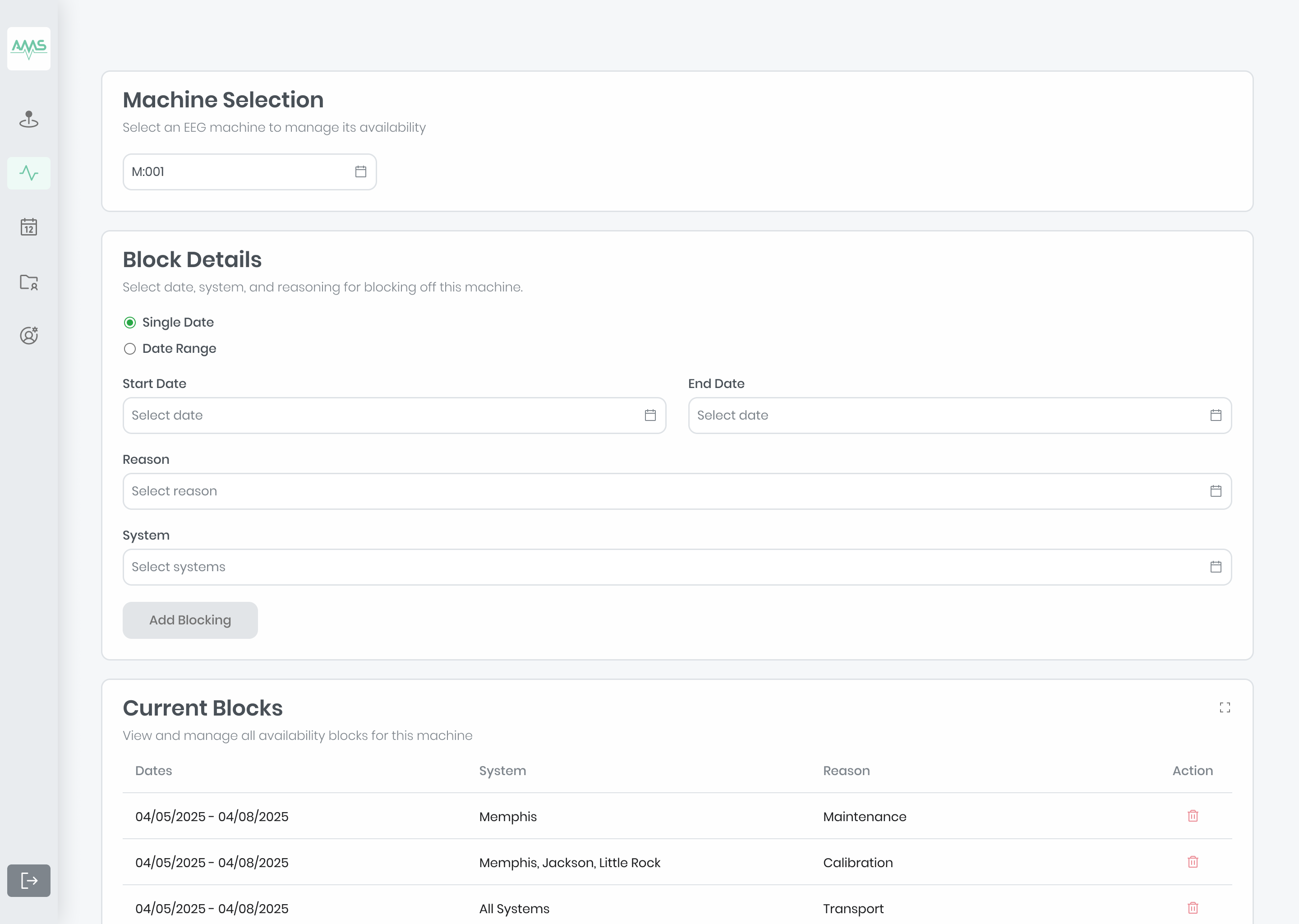 A critical feature that was implemented was Machine Blocking. This allowed scheduling technicians to easily edit each EKG device’s availability by blocking off devices for maintenance, recalibration, or travel time between locations.