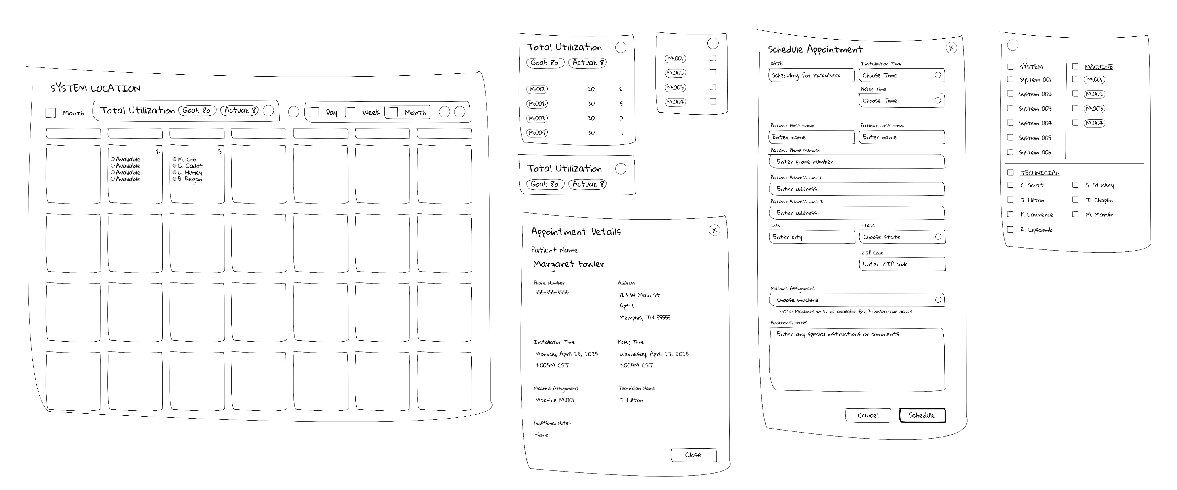 Diagram 1) A preliminary sketch of core components. Calendar View, Machine Utilization View, Schedule Appointment, Appointment Details, Filter.