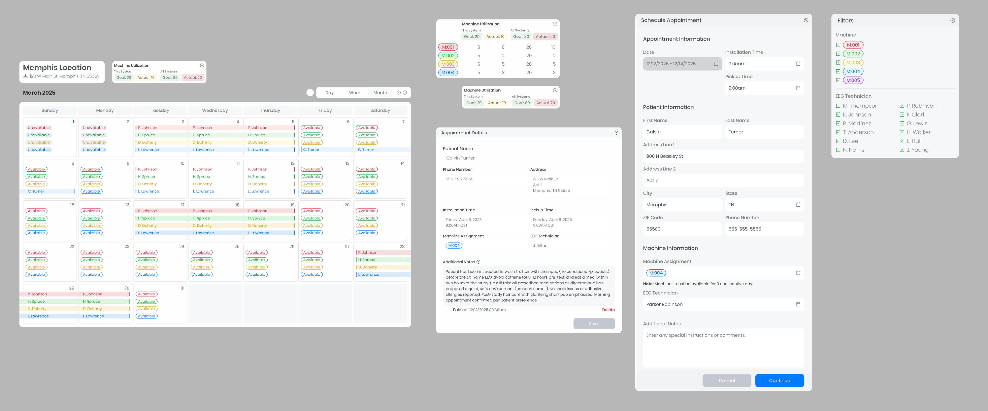 Diagram 2) A polished design of core components. Calendar View, Machine Utilization View, Schedule Appointment, Appointment Details, Filter.